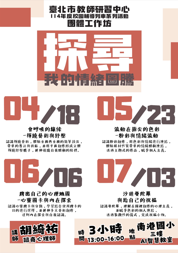 一、依據本市教師研習中心114年2月17日北市師輔字第 1446000430號函及本校申辦計畫辦理。