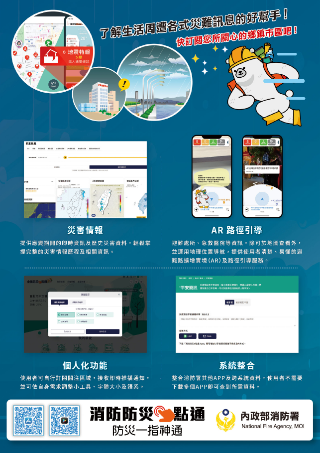 具備災害示警推播、各類災害防救指 引、119報案定位、查詢鄰近避難處所及防空避難設施、