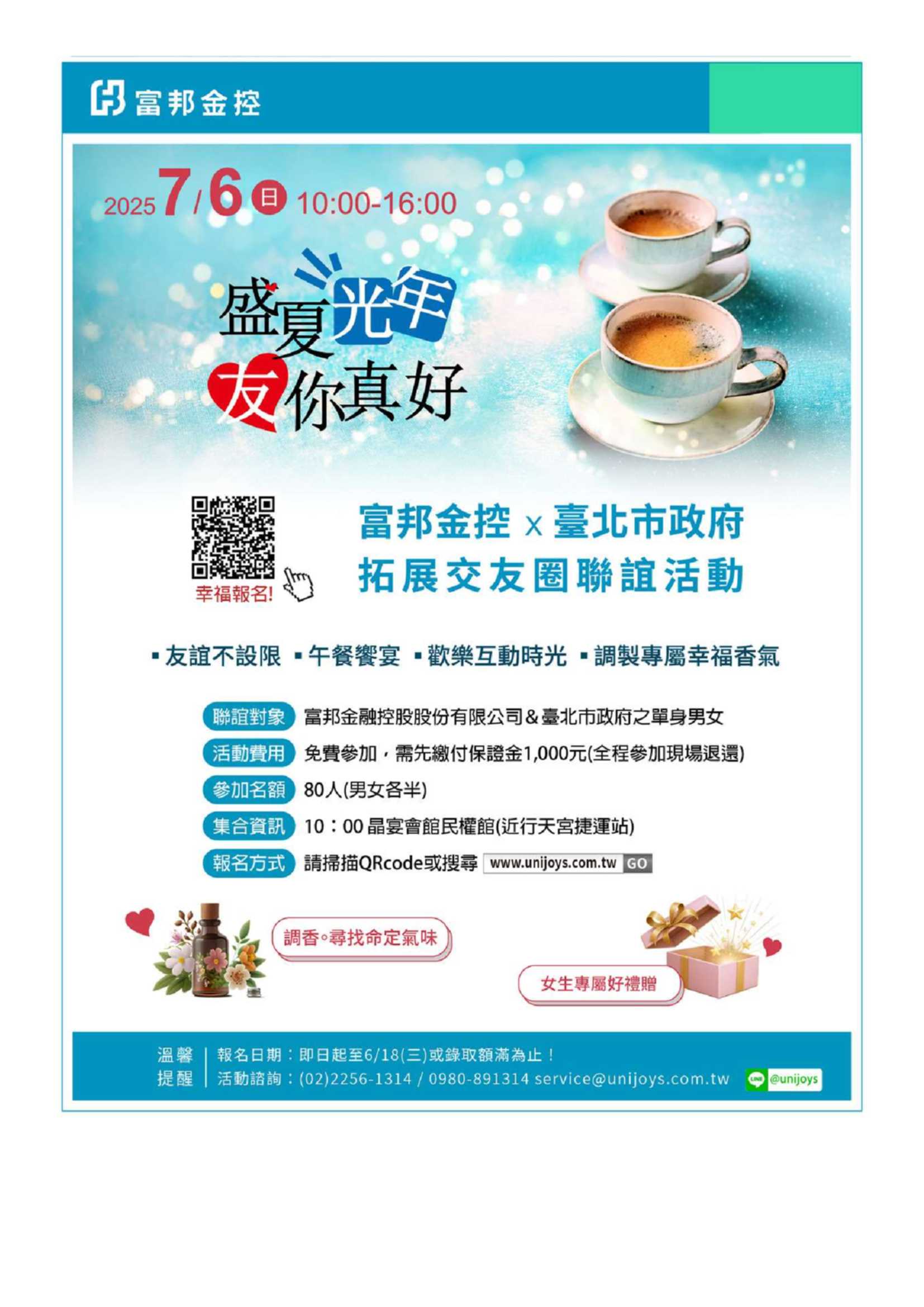 (六)參加對象:本府各機關(構)學校及富邦金控(含富邦相關企業集團)之現職單身員工。