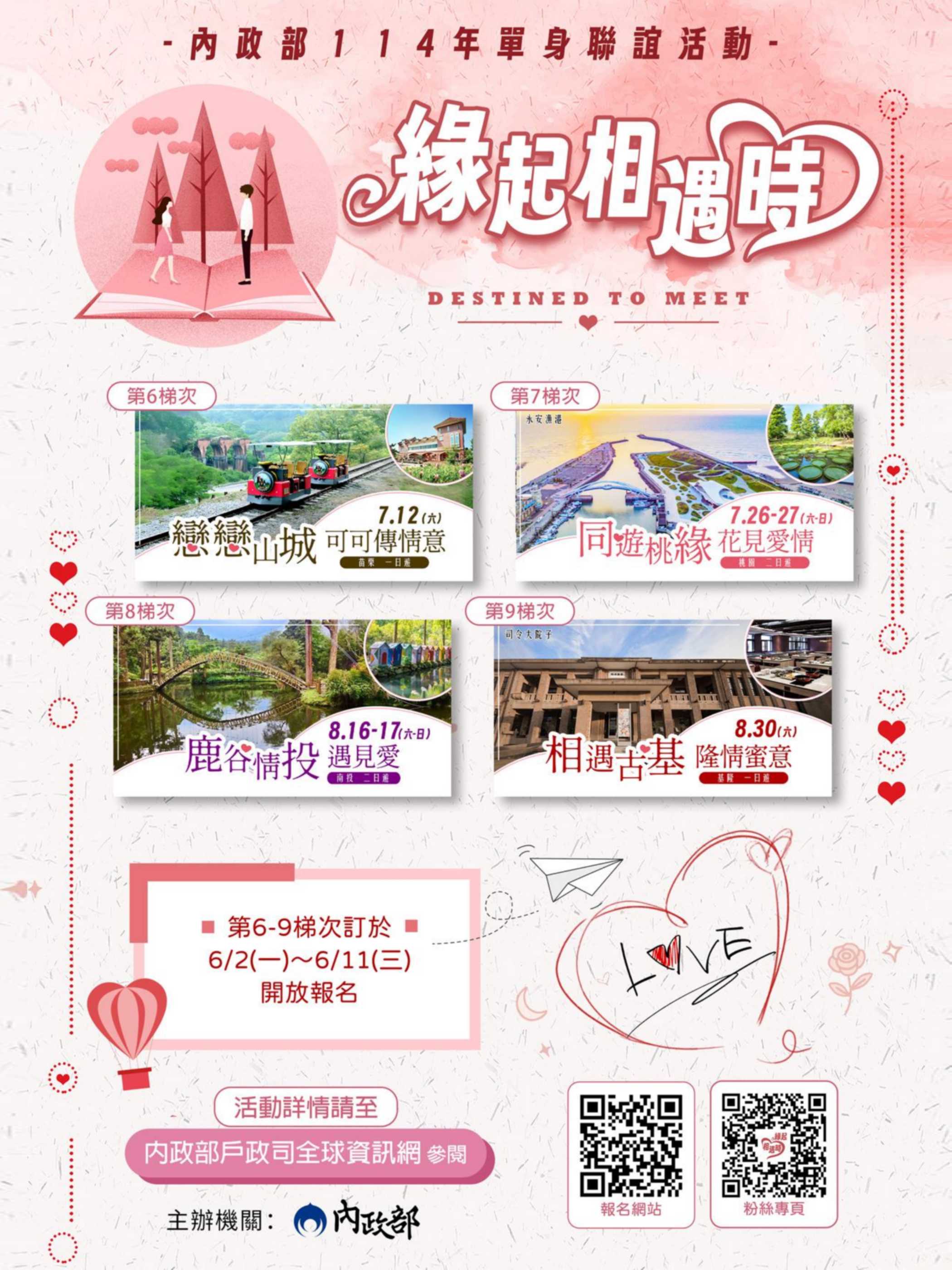 內政部114年「緣起相遇時」單身聯誼活動第6-9梯次,6月2至11日開放報名,歡迎單身者踴躍報名。活動詳情及報名資訊請參閱內政部戶政司全球資訊網(主題資訊—單身聯誼活動專區)。
