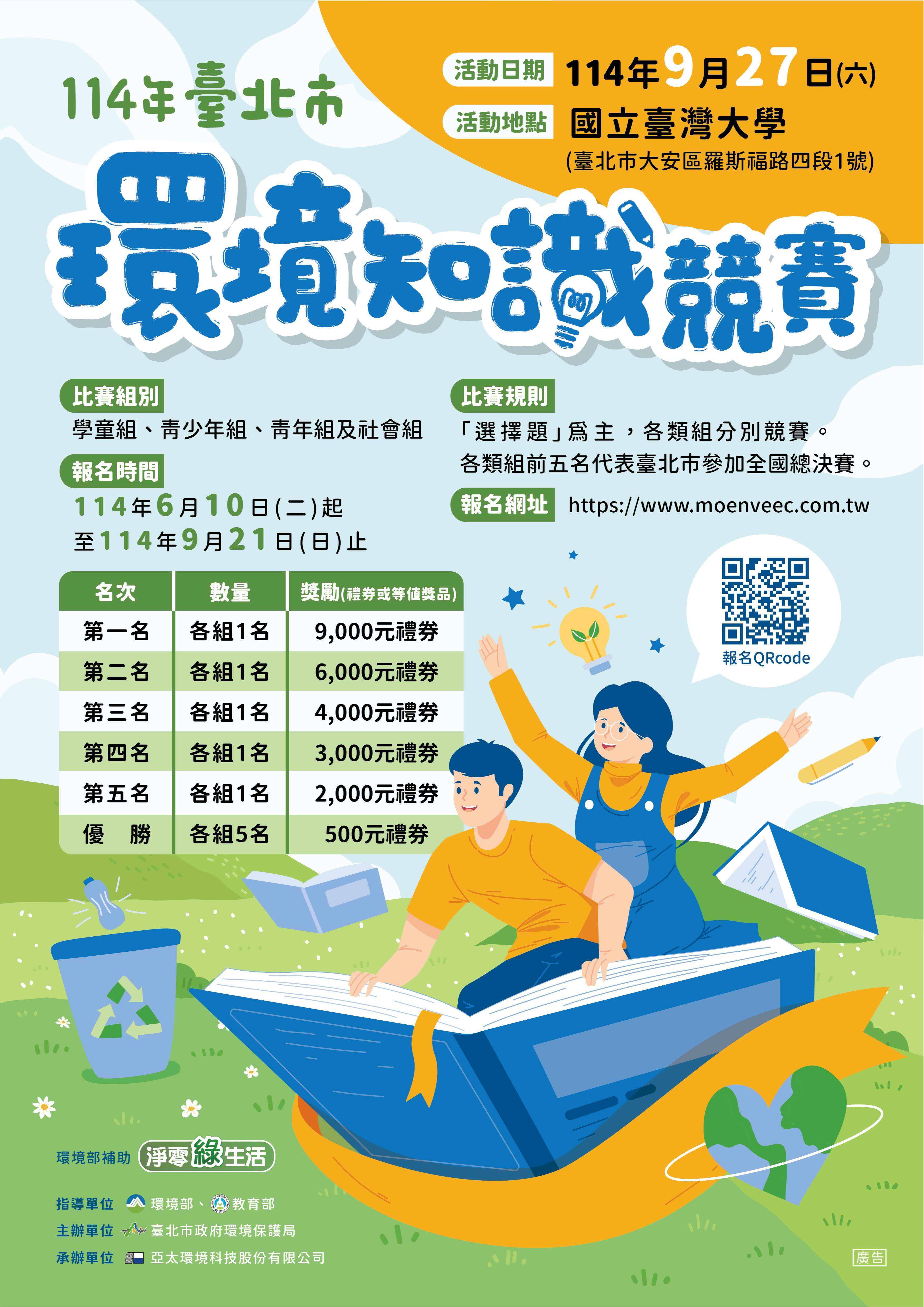 說明: 一、依教育部114年5月27日臺教資(六)字第1140054935A號函 及本府環境保護局114年6月4日北市環綜字第1143046863號 函辦理。 二、為提升全民環境素養,並以寓教於樂方式吸引民眾及學校 師生學習環境知識,環境部與教育部共同辦理旨揭競賽活 動,競賽規劃內容及辦理期程摘要如下: (一)競賽報名組別:分為學童組、青少年組、青年組及社會 組共4組。 (二)競賽方式:採初賽及決賽兩階段辦理。說明如下: 1、臺北市初賽訂於114年9月27日假國立臺灣大學辦理, 各組取前5名代表本市參加決賽。 2、決賽訂於114年11月15日假國立臺灣大學辦理。(三)獎勵方式:進入決賽者頒發獎狀及禮券。 三、請貴校鼓勵師生及職員工踴躍參與,並秉權責核予有關帶 領或出席競賽之教職員工公(差)假課務派代。 四、相關資訊請至活動網站查詢(https://www.moenveec.com. tw,於114年6月10日開放報名),如有相關問題,請洽本 市環保局彭先生,電話:(02)27208889轉7232。 五、檢附114年環境知識競賽須知、114年臺北市環境知識競賽 須知及海報各1份。