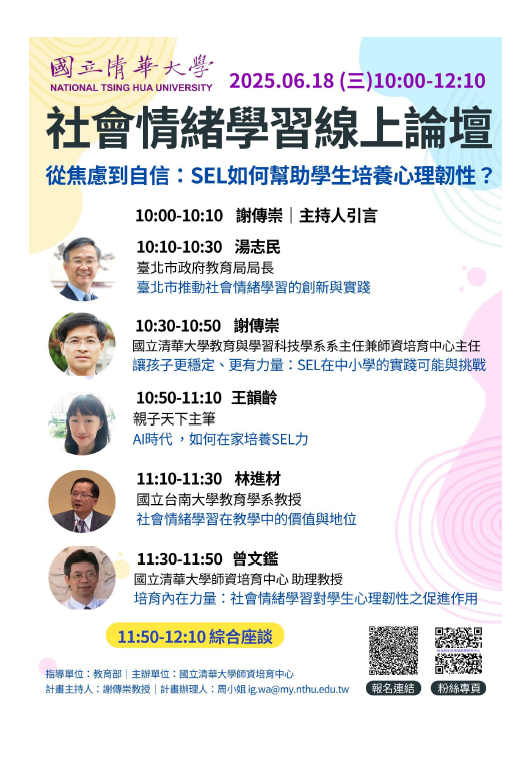 二、該校師資培育中心訂於114年6月18日上午10時至12時舉辦 「社會情緒學習-從焦慮到自信:SEL如何幫助學生培養心 理韌性?」線上論壇,旨在探討如何透過系統性教學,培 養學生的自我覺察、情緒管理、人際互動與責任決策能 力。透過專家講座與實務交流,期能協助教師深化SEL理念 與教學策略,進而促進學生全人發展,強化學校教育支持 系統。