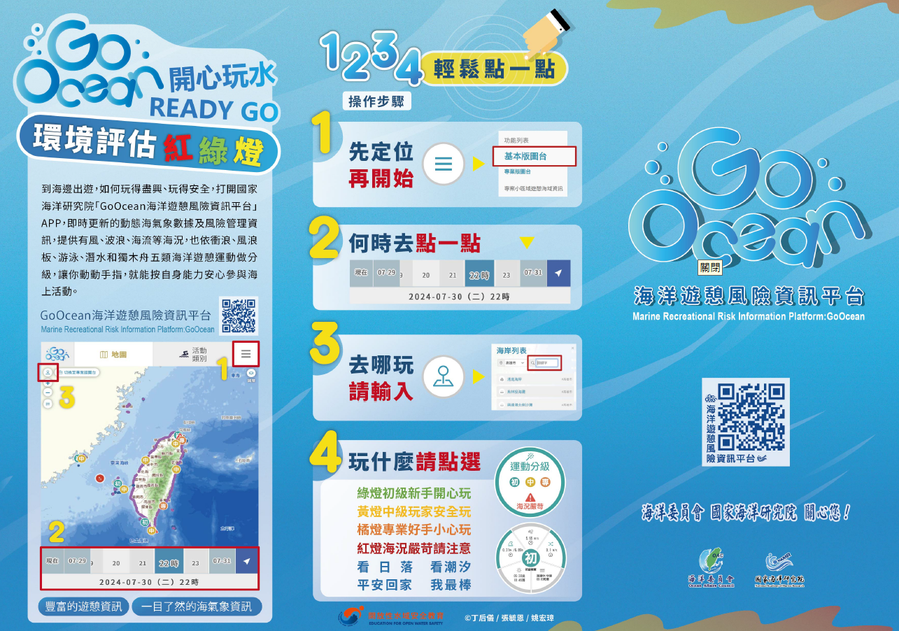 國家海洋研究院為提升國人海洋遊憩安全風險自主管 理意識,開發GoOcean海洋遊憩風險資訊平台(含行動 APP)
