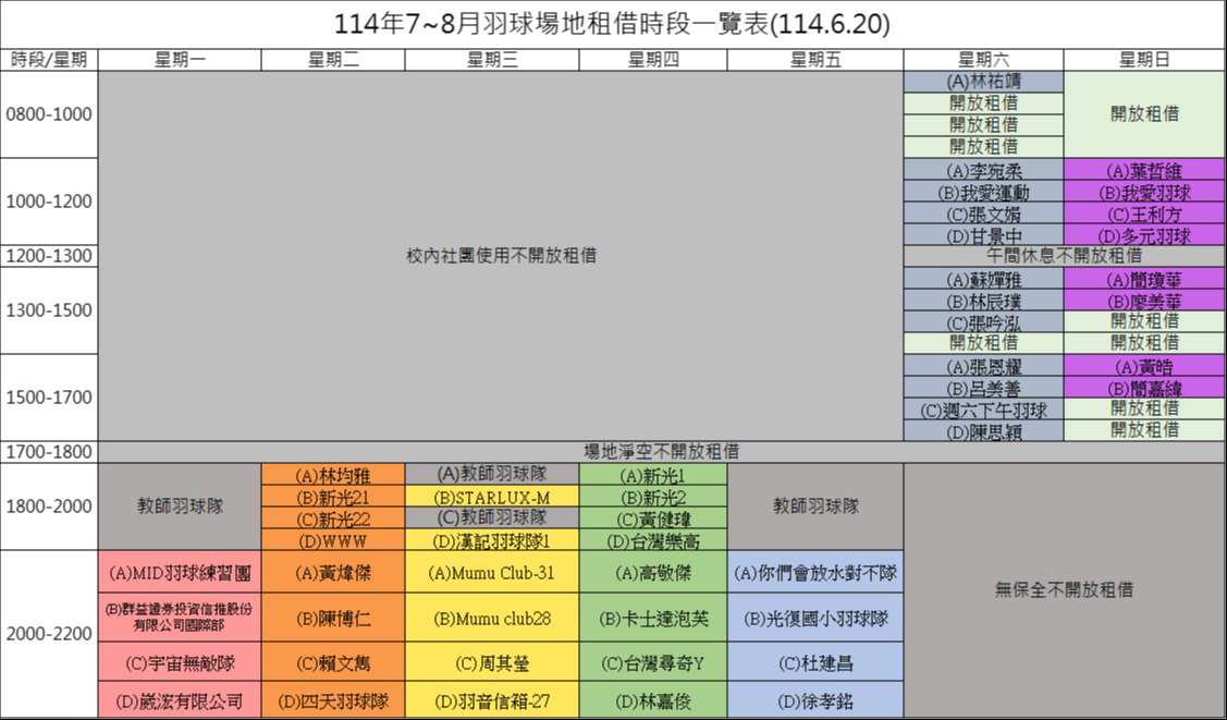 一、本校114年7~8月份羽球場地租借第2次抽籤結果如下: