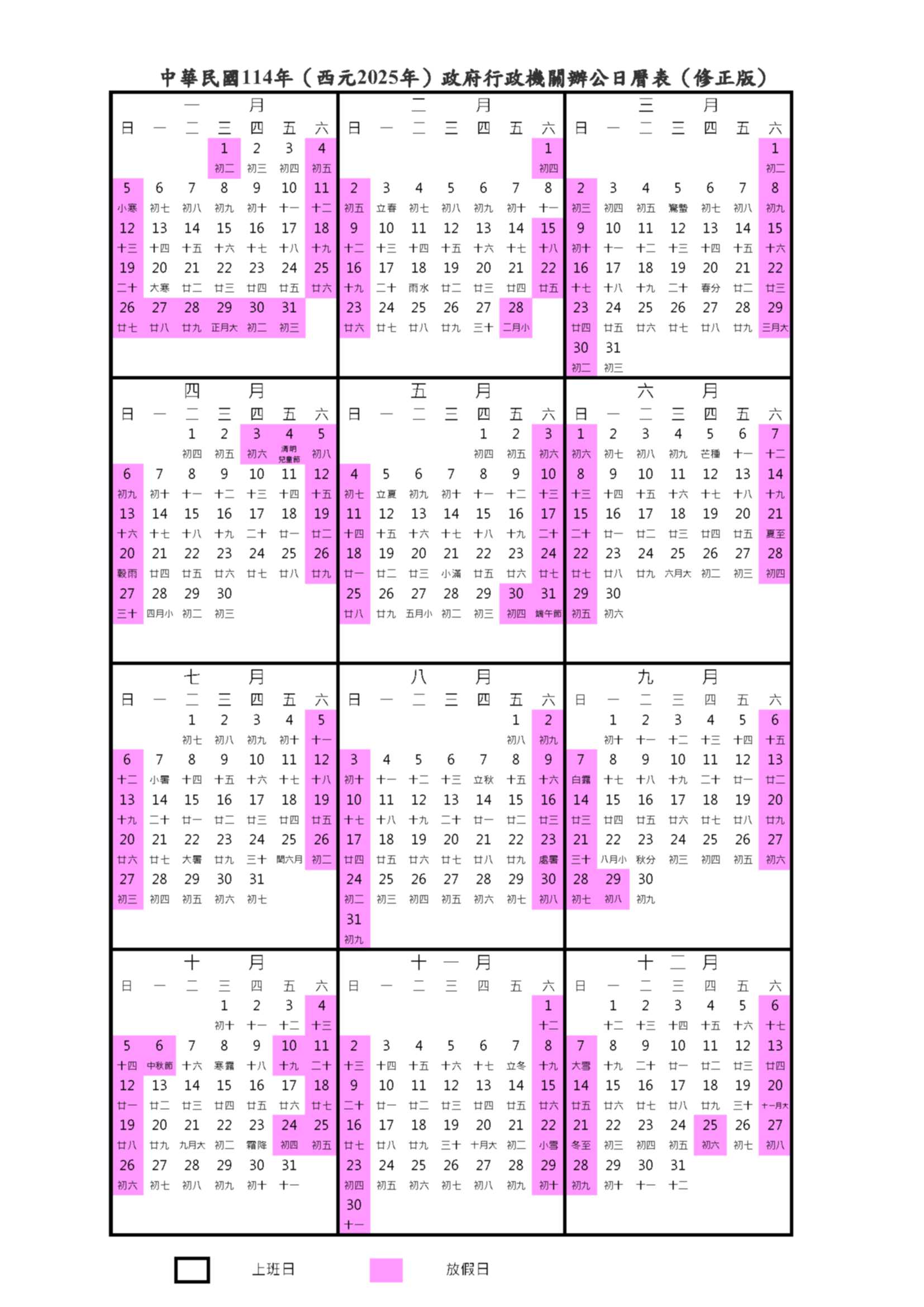 三、修正後之114年辦公日曆表已登載於本總處全球資訊網(https://www.dgpa.gov.tw/),請自行下載使用。