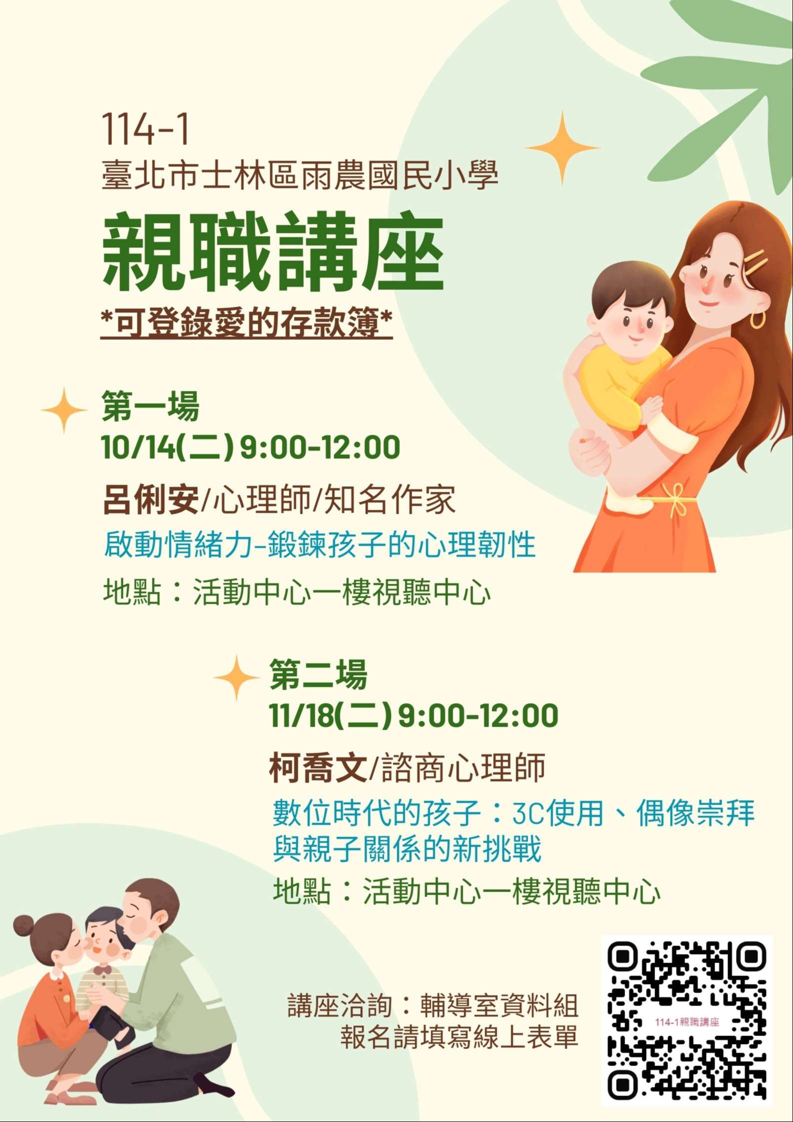 (一)第一場:啟動情緒力–鍛鍊孩子的心理韌性 1、講師:呂俐安 心理師/知名作家 2、時間:114年10月14日(星期二) 9:00-12:00 3、地點:本校活動中心一樓視聽中心