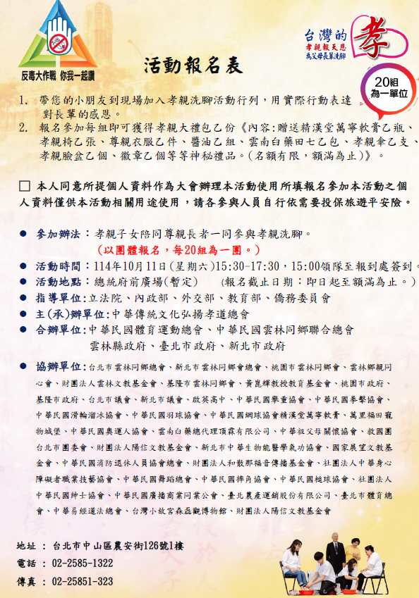 為弘揚孝道及推廣反毒政策,該會於114年10月11日(星期 六)下午3時30分假總統府前廣場辦理「2025台灣的孝—百 善孝為先 為父母長輩洗腳暨反毒宣導」活動,邀請孝親子 女陪同尊親長者一同參與孝親洗腳,用實際行動表達對長 輩的感恩。