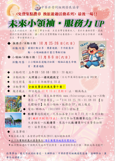 八、報名方式:請至本會網站 www.chinesenpo.org.tw→活動 專區→『研習專區』→『114.10.25-26、11.08-09 【台北體驗營】未來小領袖‧服務力UP』線上報名