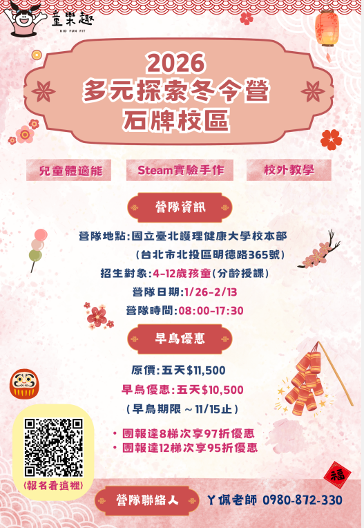 二、營隊時間:自115年1月26日(一)至115年2月13日(五),周 一至周五,早上08:00至下午17:30,共三梯次,不含六 日。