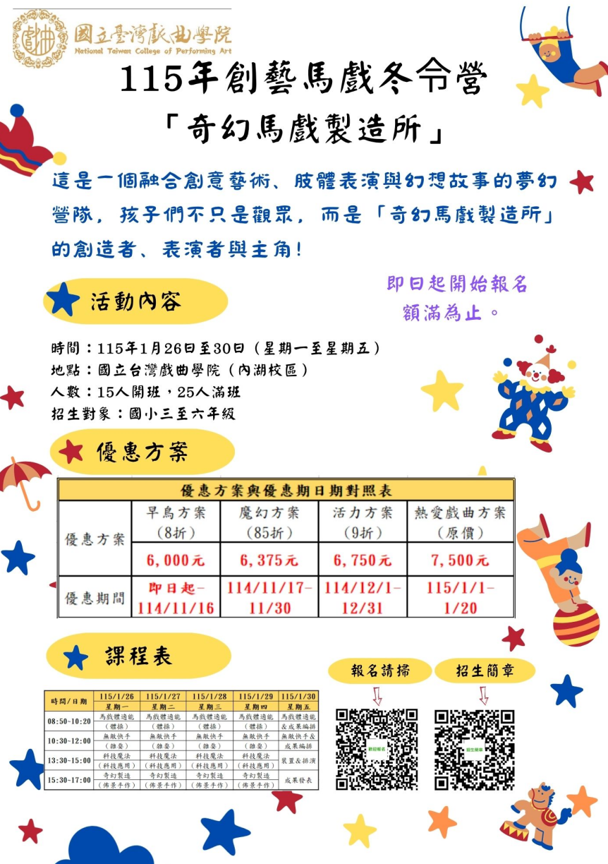 一、旨揭本案融合「馬戲體適能」、「無敵快手」、「科技魔 法」、「奇幻製造」課程,打造的一個充滿創意與魔法的 寒假冒險!在這裡,空中飛人與光影共舞,小丑的魔術球 由程式控制,舞台佈景來自你的親手創造!我們將帶領孩 子穿越傳統,融合科技,打造一個專屬於他們的、獨一無 二的未來馬戲舞台!