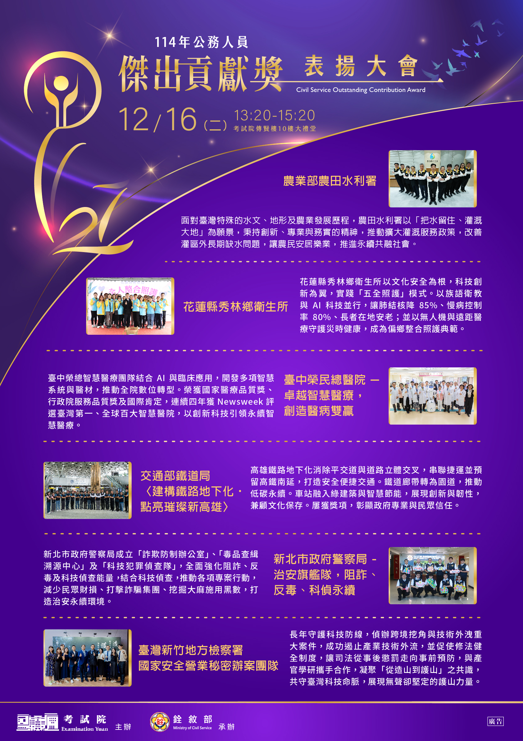 二、114年公務人員傑出貢獻獎業經考試院組成評審委員會評選出6名得獎人及6組得獎團體;考試院為表揚得獎者傑出事蹟,訂於114年12月16日(星期二)下午1時20分於該院傳賢樓10樓大禮堂舉行表揚大會。