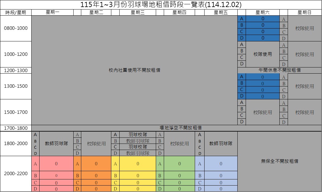 一、本校115年1~3月份羽球場地租借開放申請,本次採線上與紙本併行方式報名,並採線上抽籤,請報名單位詳閱附件規範(附件1)。
